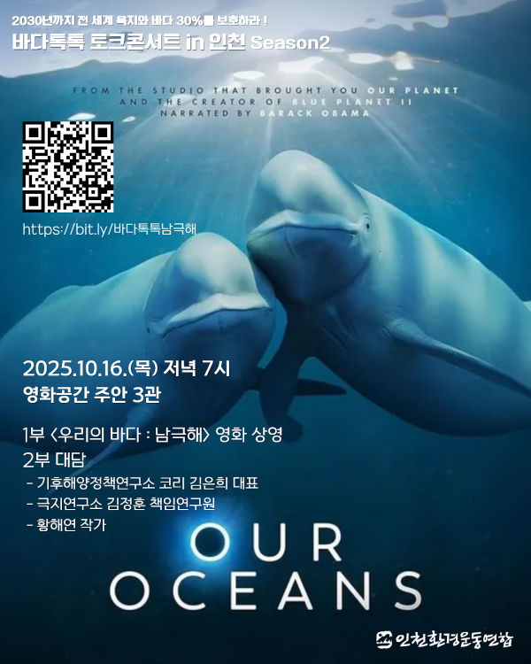 넷플릭스 다큐멘터리 <우리의 바다: 남극해>를 함께 보고, 왜 지금 남극 해양보호구역(MPA) 확대가 필요한지 30분 토크로 이야기합니다. 인천 시민의 시선에서 ‘왜 지금, 남극해인가’를 묻고, 우리의 다음 행동을 찾는 자리입니다.