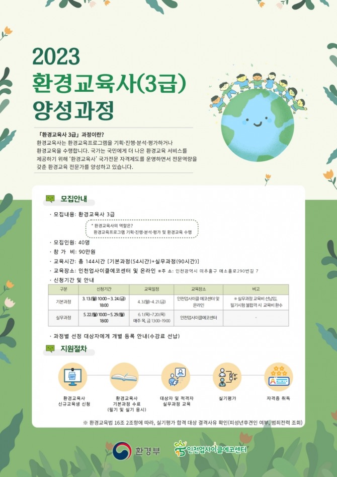 이미지 확대보기환경부 인증 환경교육사 양성 모집 포스터. 사진=미추홀구인천 미추홀구는 산하기관 인천업사이클에코센터를 통해 오는 13일부터 환경교육사 양성과정 교육생을 모집한다고 9일 밝혔다.